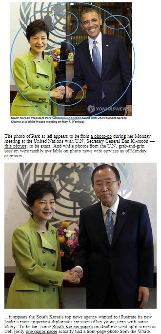 박근혜 대통령이 미국을 방문해 버락 오바마 대통령과 악수하는 듯한 이 사진을 미국의 인터넷 매체 허핑턴포스트가 이렇게 불렀다. 애틀랜틱 와이어는 "남한은 북한보다 포토샵을 더 못한다"고 제목을 붙였다.