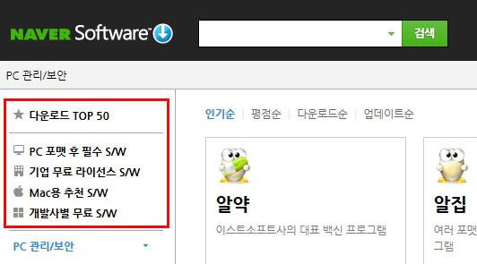 네이버 소프트웨어 왼쪽 상단에 'PC 포맷 후 필수 S/W', '기업 무료 라이선스 S/W', 'Mac용 추천 S/W', '개발사별 무료 S/W' 등의 메뉴가 있다. 각 주제별로 알맞은 소프트웨어를 한자리에 모아놓았다. 예를 들어 PC 포맷 후 필수 SW는 백신, 압축, 문서, 메신저, 동영상 재생 등 카테고리 별로 인기 있는 소프트웨어를 제공한다.