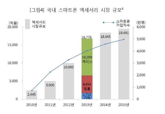 실제 KT경제경영연구소는 2010년 초 국내 스마트폰 시장 액세서리 시장규모를 2445억원, 2011년 5000억원, 2012년 1조원으로 추정하고 있다. 해마다 100% 가량의 성장률을 보인 것이다.