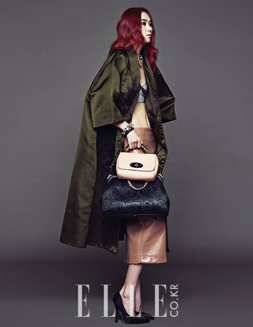 장수임이 입은 브라톱과 스커트, 오버사이즈 코트, 새틴 소재 하이힐과 크리스털 장식 네크리스와 브레이슬릿은 모두 가격 미정, Miu Miu.닥터백은 가격 미정, Ralph Lauren Collection.살구 컬러 미니 체인 백은 1백89만8천원, Mulberry.