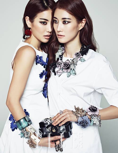 (왼쪽부터) 양윤영이 입은 비즈 장식의 화이트 드레스와 투명한 뱅글, 클러치백은 모두 가격 미정, Chanel.레드 이어링은 가격 미정, Marni.푸른색 플라스틱 뱅글은 가격 미정, Giorgio Armani.이현이가 착용한 화이트 셔츠와 스커트는 모두 가격 미정, Jil Sander.볼드한 플라워 네크리스는 3백10만원, 플라워 뱅글은 각각 82만원, 모두 Feverish. 크리스털 링은 33만원, Swarovski.