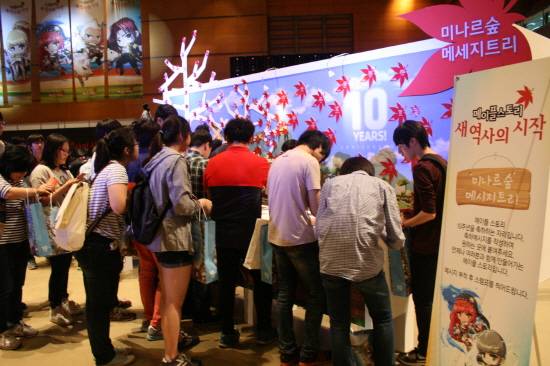 넥슨은 19일 서울 삼성동 코엑스에서 '메이플스토리' 10주년을 기념하는 행사를 열었다. 오후 3시부터 시작한 이날 행사에는 흐린 날씨에도 3000여명의 인파가 몰려 메이플스토리의 인기를 실감할 수 있었다. 특히 청소년 유저들이 북적였다.