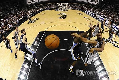 epa03711126 San Antonio Spurs center Boris Diaw of France (R) passes as Memphis Grizzlies power forward Zach Randolph (C) defends in the second half of their NBA basketball playoff Western Conference Finals game 2 at AT & T Center in San Antonio, Texas, USA, 21 May 2013. The winner of the best of seven will advance to the NBA Finals. EPA/LARRY W. SMITH CORBIS OUT