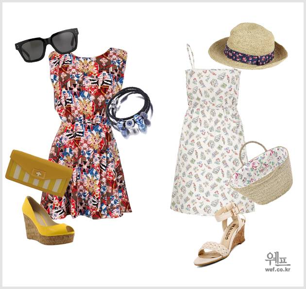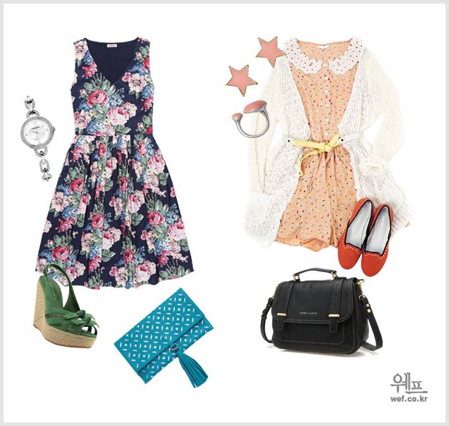 (L) 여름에는 잔잔한 프린트보다 큰 플로럴 프린트가 더 시원해 보인다. 여성스러움을 극대화 시킨 풀 스커트 드레스에 비비드 컬러의 웨지힐과 클러치를 선택하자. 빅 사이즈 플라워 패턴 드레스 때문에 다른 아이템을 심플한 디자인으로 선택한다면 오히려 스타일을 다운시킬 수 있음을 명심하자. 컬러 선택이 고민이 된다면 드레스 컬러 중 일부분을 액세서리 컬러로 통일감을 주는 것이 좋다.