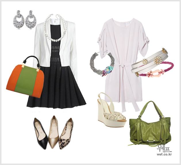 (L) 심플한 실루엣의 블랙 원피스에 화이트 쇼트 재킷. 그야말로 인터뷰 혹 상견례 때나 입을 법한 스타일이지만 깔끔한 인상을 줄 수 있어 오피스 룩으로 제격이다. 블링블링 이어링으로 포인트를 주고 단아함의 상징 진주목걸이를 매치하자. 진주 목걸이가 올드해 보인다는 생각 자체가 올드하다는 사실을 기억하자. 오렌지와 그린 투 톤 토트백은 고루한 이미지의 스타일을 벗어 날 수 있게 해준다. 여기에 신뢰감을 줄 수 있는 적당한 굽의 포인티드 슈즈를 선택 할 것.