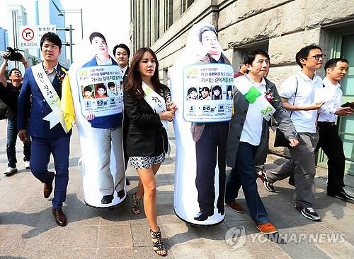 (서울=연합뉴스) 이지은 기자 = 제7회 실종아동의 날을 맞아 최근 개봉영화 '몽타주'에 출연한 배우 엄정화와 김상경이 정근섭 감독과 함께 24일 오후 서울시민청에서 열린 '착한 릴레이 캠페인'출정식을 마친 후 등신대를 들고 서울광장으로 이동하고 있다. 등신대는 전단지를 들고 실종아동을 찾는 아버지의 모습을 오뚜기 모양으로 만든 것으로 서울 시내 곳곳에 설치해 많은 시민에게 실종아동 정보를 알려주는 역할을 한다. 2015.5.24