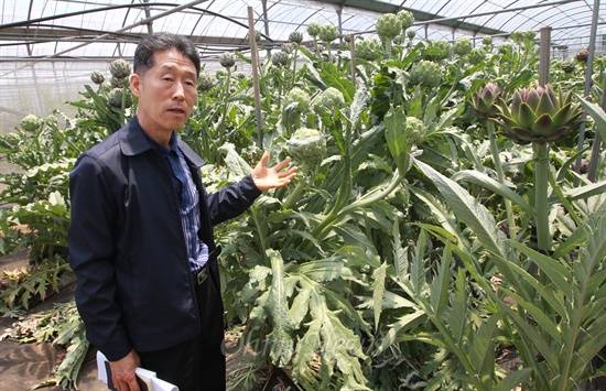 | ▲ 13일 오전 제주 오등동에 위치한 농촌진흥청 온난화대응농업연구센터에서 성기철 아열대작물재배연구실 농업연구관이 지구 온난화에 대응하기 위해 미래 소득작물로 개발 중인 아티초크를 보여주고 있다. 이곳에서 재배되는 아티초크는 품종별 꽃눈이 분화하는 시기와 생육, 수량, 품질 등을 조사하고 있다. |