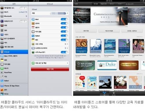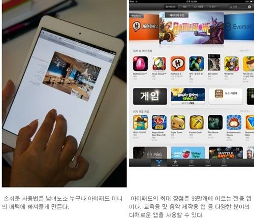 ◆아이클라우드와 아이튠즈 스토어 제공 = 애플판 클라우드 서비스 '아이클라우드'를 사용할 수 있는 것도 아이패드 미니의 장점. 이 서비스를 이용하면 아이폰이나 아이패드 등 기기의 모든 데이터가 인터넷상의 '아이클라우드'에 저장된다. 따라서 아이폰/아이패드를 분실하거나 갑작스러운 고장에도 간단하게 데이터 복구가 가능하다. 동영상과 음악 전용 콘텐츠 장터인 '아이튠즈 스토어'도 이용할 수 있다. 음악이나 영화를 비롯한 콘텐츠 구입이 가능하다.