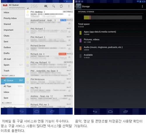 ◆구글의 다양한 서비스 사용 쉬워 = 구글이 만든 OS이므로 구글이 제공하는 다양한 서비스와 궁합이 좋은 것도 장점 중 하나다. 지메일 및 구글 캘린더, 구글 지도 등 평소 컴퓨터에서 사용하던 서비스를 안드로이드 스마트폰 또는 넥서스7 등 태블릿PC에서도 간편하게 사용할 수 있다. 지메일 계정만 등록하면 PC나 스마트폰 등 다른 기기에서 사용하던 데이터를 그대로 가져올 수 있으므로 편리하다. 평소 구글 서비스 사용량이 많다면 안드로이드 태블릿PC 넥서스7가 최적이다.