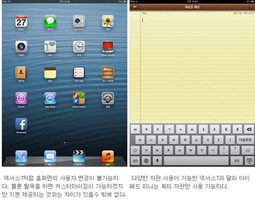 이상으로 모바일 OS의 쌍두마차격인 iOS와 안드로이드를 채택한 아이패드 미니와 넥서스7을 기준으로 각각의 장단점을 살펴봤다. 태블릿PC를 구입할 때 먼저 각각의 OS 특성을 고려한 후 자신에게 맞는 것이 어느 것인지 결정하는 센스가 필요하다.