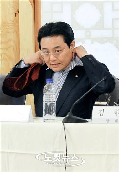 전병헌 민주당 원내대표가 2일 오전 서울 여의도 국회 의원동산 사랑재에서 열린 최고위원회-시·도지사 '을(乙)'을 위한 정책간담회에서 넥타이를 풀고 있다. 국회는 여름철 전력대란이 우려되자 에너지절약 노력에 동참키로 해 6월부터 회의에 넥타이를 매지 않기로 했다.raphacondor@cbs.co.kr
