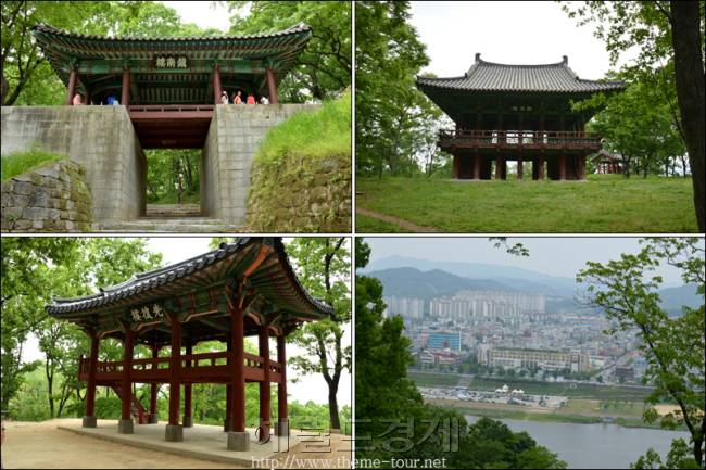 공산성의 남문인 진남루, 임류각, 성곽길에서 본 금강과 공주의 강북시가지, 광복루(사진 위 왼쪽부터 시계방향) |