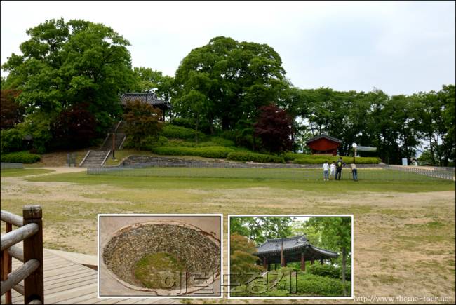 웅진으로 옮겨온 백제 왕궁터(큰 사진). 연꽃 심었던 인공연못(작은 사진 왼쪽)과 쌍수정 |