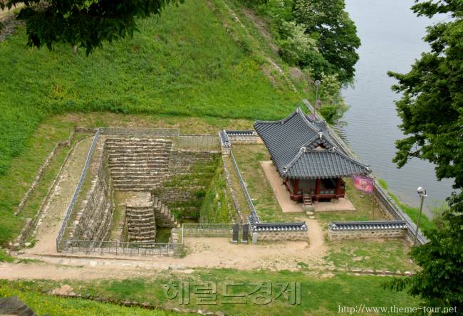 다시 성곽길을 걸어 내리막으로 내려오니 경치좋은 금강 가에 멋진 누각이 운치를 자아내고 있었다. 만하루(挽河樓)다. 연지(蓮池)라고 하는 연못과 금강 사이에 서로 바짝 붙어 있다. 이 연지는 네모나게 석축한 것으로 금강 물과 서로 통하게 만들어 적에 노출됨이 없이 강물을 이용할 수 있게 만들었다. 통로도 적이 못보게 참호 처럼 만들어 놓은게 눈길을 끌었다.
