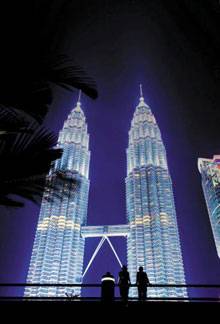 페트로나스 트윈 타워는 쿠알라룸푸르의 랜드마크다. 정유회사 페트로나스사의 사옥이다. 88층, 높이 452m로 세계에서 가장 높은 쌍둥이 빌딩이다. 밤이 되면 보석처럼 빛나는 눈부신 조명으로 아름다운 모습을 뽐낸다. 각종 영화에 나오면서 이 도시를 대표하는 건물이 됐다. 조명이 들어오면 건물 근처에 이를 배경으로 기념사진을 찍으려는 사람들로 넘쳐난다.