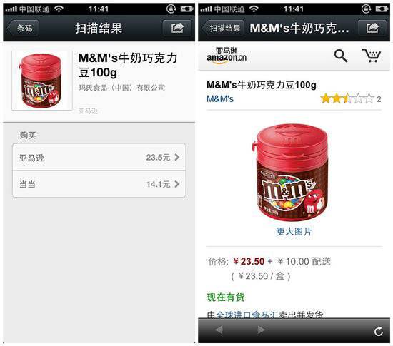 새로운 위챗은 눈앞에 있는 실물 제품을 그 자리에서 쇼핑할 수 있다. 상품의 바코드를 스캔하면 스마트폰에서 바로 전자상거래 판매 정보 페이지로 연결된다. 특정 초콜릿의 바코드를 스캔하면 판매 페이지로 연결된다.