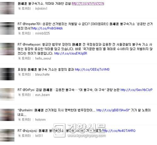 '원세훈 불구속 기소'와 관련된 트위터리안들의 글들이 12일 트위터 등 소셜네트워크서비스에 쇄도했다. | 인터넷 포털 페이지 캡처"성공한 선거범죄는 처벌할 수 없는 것인가", "원세훈 전 원장 수사과정에서 황교안 법무부장관은 법리 검토를 운운하며 절차를 지연시켜 검찰 수사에 개입하여 수사의 독립성을 훼손했다", "국정원 직원들이 말한 '우리는 지시하지 않은 일 안한다'는 내용이 충격적이다" 등의 지적도 잇따랐다.