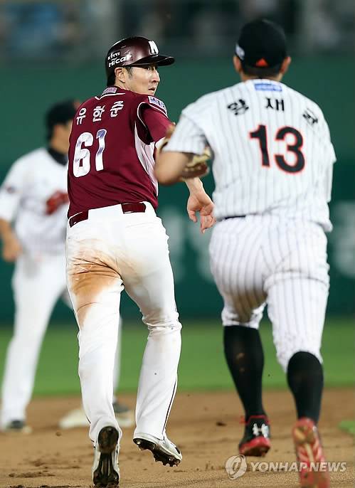 (부산=연합뉴스) 조정호 기자 = 12일 부산 사직구장에서 열린 프로야구 넥센 대 롯데 경기. 7회초 1사에서 넥센 서건창의 내야땅볼 때 2루 주자 유한준이 3루로 뛰다가 롯데 3루수 황재균에 태그 아웃되고 있다. 2013.6.12.