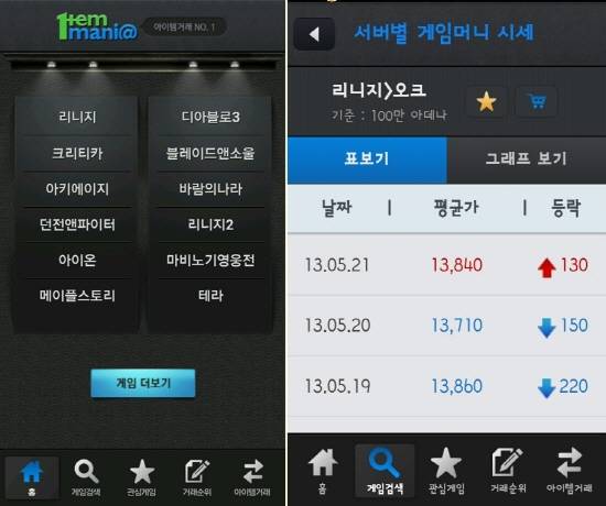 아이템매니아의 게임시세를 모바일로 실시간 확인 가능
