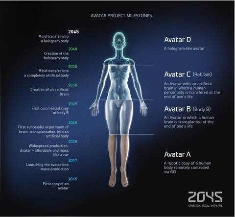 영화 '아바타(AVATAR)'나 브루스 윌리스 주연의 영화 '써로게이트(Surrogates,2009)'같은 방식으로 불멸의 인간을 만드는 계획이 추진되고 있다. 누군가를 대체할 대체 몸통 격인 아바타를 만들고 원본 격인 인간이 아바타의 뇌를 지배하면서 영원히 살 수 있게 한다는 계획이다. 계획대로라면 오는 2035년 불멸의 인간을 볼 수 있게 될 전망이다.