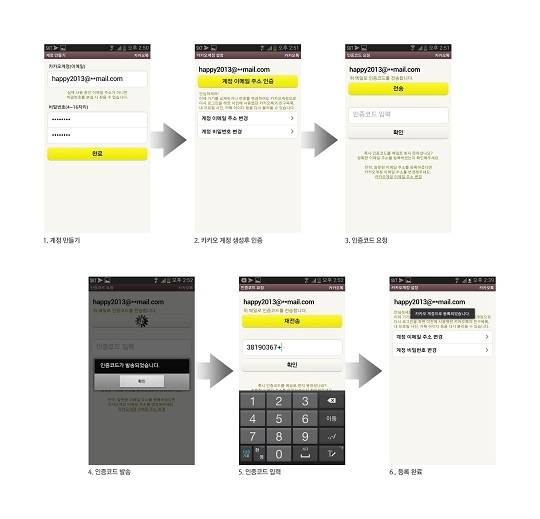 ▶ '더보기 > 카카오계정'에서 이메일 주소 형태로 된 카카오계정 생성 ▶ 카카오 계정을 만든 이후에는 '계정 이메일 주소 인증'을 누른다. ▶ 입력 메일로 인증코드 전송 ▶ 메일로 인증코드 발송 ▶ 메일로 받은 인증코드 입력 ▶ 카카오 계정 등록 순으로 진행한다.