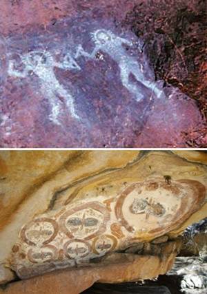 ↑ 이탈리아 발 카모니카에서 발견된 고대의 그림들. 그림속 인물이 우주비행사라는 주장이 제기돼왔다(위). 아래는 사하라 사막에서 발견된 암벽화. |