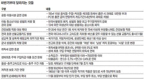 ▲공중 이용시설 금연 확대=150㎡ 이상 음식점·주점·커피점·제과점 등 공중 이용시설에서 흡연을 하다 적발되면 10만원의 과태료가 부과된다. PC방도 금연 대상으로 추가되지만 올해 말까지는 계도기간이고, 내년부터 처벌이 시작된다.