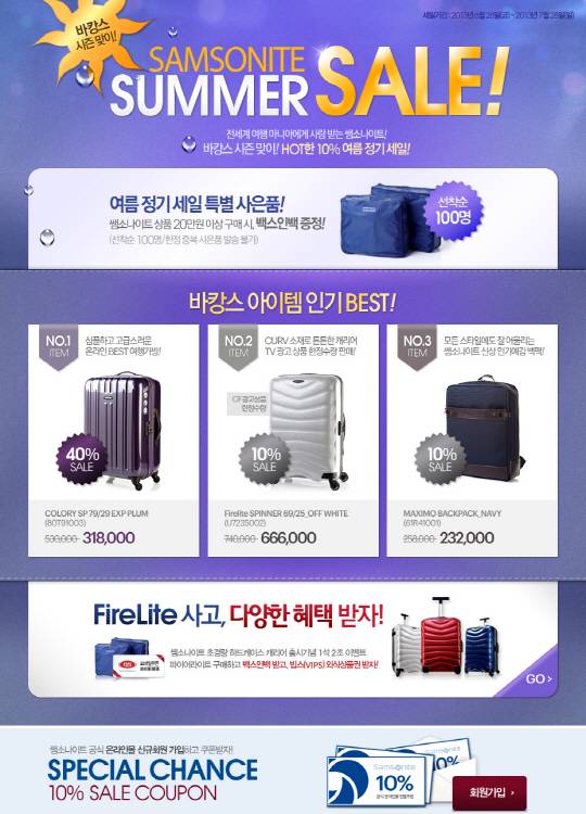 세계적인 라이프스타일 브랜드 쌤소나이트(www.samsonite.co.kr)가 바캉스 시즌을 맞아 쌤소나이트 공식 온라인몰(www.samsonitemall.co.kr)에서 전 제품 10% 할인하는 여름 정기 세일을 7월 28일까지 진행한다.