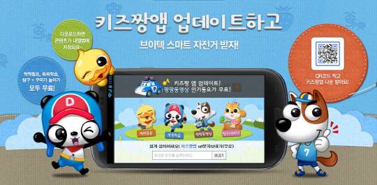 지난 4월 안드로이드용으로 출시된 키즈짱 앱은 아이들이 즐겁고 재미있게 학습할 수 있도록 동영상, 동요 등 멀티미디어를 적극 활용해 인기를 모으고 있다. EBS 딩동댕 유치원에서 방영된 '체조놀이', 아이와 엄마가 함께 부를 수 있는 '재미동요', 아이들이 좋아하는 공룡을 주제로 한 '공룡송' 등을 비롯해 '마법한글', '지능놀이', '단어챈트' 등의 고품질 학습 콘텐츠를 통해 한글, 영어 학습도 가능하다.
