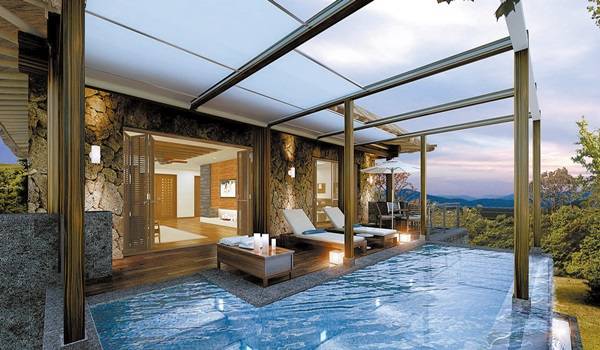 (위)30℃ 온수 풀이 갖춰진 사계절 야외 스파 & 가든 '해온' (아래)개인 수영장은 수중 조명과 최신 전동 캐노피, 선베드 등을 갖췄다. 넓은 침실과 벽난로가 있는 거실