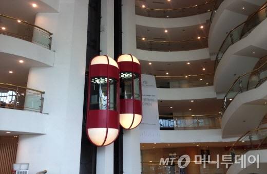 새롭게 단장한 한화리조트 산정호수 안시. 리조트에서 들어서면 가장 먼저 눈에 띄는 붉은 캡슐 모양 엘레베이터가 명물이 됐다/포천=이지혜 기자 |