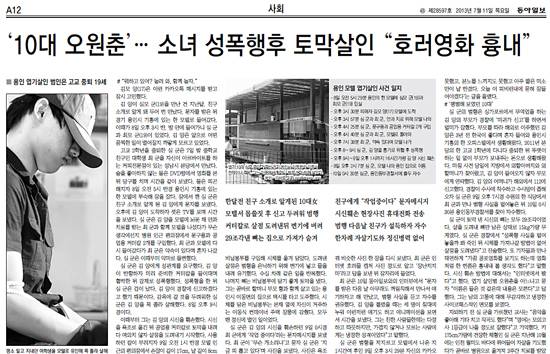 더 이상 옮길 수 없을 정도다. 30℃가 넘는 무더위를 식혀주는 '호러' 영화나 소설 이야기라고 생각하는 이들도 있겠지만, 아니다. < 동아일보 > 11일자 12면에 실린 기사다. 해당 기사는 경기도 용인 살인 사건를 자세히 다뤘다. 읽다보면, 사실을 그대로 전하는 기사가 아니라 엽기살인사건을 재구성한 '호러소설'처럼 느껴질 정도다.