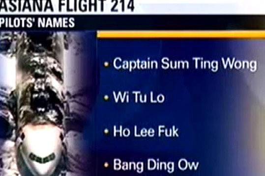 앞서 미국 폭스TV 산하 샌프란시스코 지역방송인 KTVU는 사고를 낸 아시아나 여객기 조종사들의 이름을 "섬 팅 왕(Sum Ting Wong), 위 투 로(Wi Tu Lo), 호 리 퍽(Ho Lee Fuk), 뱅 딩 오(Bang Ding Ow)" 등으로 소개했다.