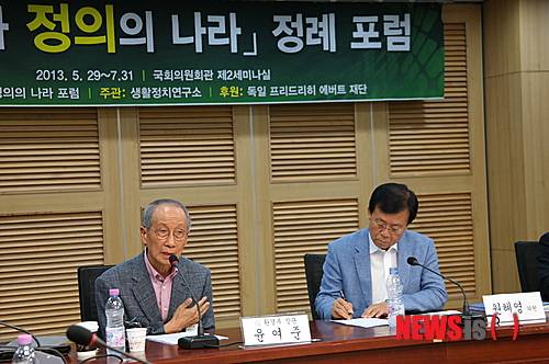 이 밖에 윤 전 장관은 NLL대화록 열람·공개와 관련해 "국회의원 개인은 헌법적 정치기관이면서도 헌법적 통치기관이기도 하다"면서 "NLL대화록 열람·공개가 본회의에서 의결되는 것을 보면서 여야 모두 입법부가 통치기관이란 생각을 가졌다면 쉽게 의결할 수 있을까하는 생각을 했다"고 일침을 가했다.