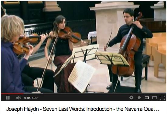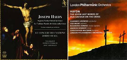 하이든은 1785년, 스페인 카디즈 성당의 성 금요일 미사에서 연주할 음악을 작곡합니다. 플루트 2, 오보에 2, 파곳 2, 호른 4, 트럼펫 2, 팀파니, 현악 5부를 위한 관현악곡입니다. 맨 앞에 서곡이 있고, 십자가에서 예수가 남긴 일곱 개의 말씀에 해당하는 일곱 개의 악장이 있고, 맨 뒤에 예수가 세상을 떠난 뒤 일어난 지진을 묘사한 에필로그가 붙어 있습니다. 따라서, 도합 9악장으로 된 교향곡으로 보아도 무방합니다. 호르디 사발이 지휘한 전곡 연주, 음악의 분위기를 잘 살린 동영상입니다. http://youtu.be/m7iLwHDmuzs (관현악 원본, 전곡)말러의 교향곡 3번과 < 대지의 노래 > 가 6개의 악장으로 돼 있고, 쇼스타코비치 교향곡 14번이 11개 악장으로 돼 있는 걸 감안하면, 지금 우리 기준으로 볼 때 하이든의 이 곡을 '교향곡'으로 간주하는 건 별로 이상한 일이 아닙니다. 죽음을 앞둔 예수의 인간적 고뇌와 번민, 끝까지 사랑을 실천하고 삶을 긍정하는 예수의 의연함을 묘사한 이 음악, 곡의 규모나 감정의 깊이로 볼 때 단연 하이든 '교향곡' 중 최고 걸작입니다.