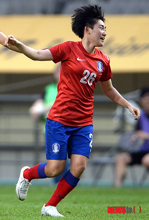【서울=뉴시스】조성봉 기자= 21일 오후 서울 마포구 서울월드컵경기장에서 열린 2013 동아시안컵 여자 경기 한국과 북한의 경기에서 첫골을 넣은 한국 김수연 선수가 기뻐하고 있다. 2013.07.21.