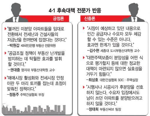 부동산 전문가들 사이에서는 이번 4·1 후속대책에 대해 대체로 긍정적인 반응이 나왔다. 공공과 민간 등 모든 부문에 대한 공급축소 의지를 시장에 확실히 전달해 매매수요를 자극하겠다는 의도는 현재 시장상황에 적합한 대책이란 평가다.