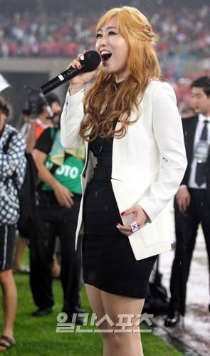 28일 오후 서울 잠실종합운동장에서 열린 2013동아시안컵 남자축구 한국-일본전에 앞서 팝페라 가수 이사벨이 태극반지를 낀 채 애국가를 열창하고 있다.