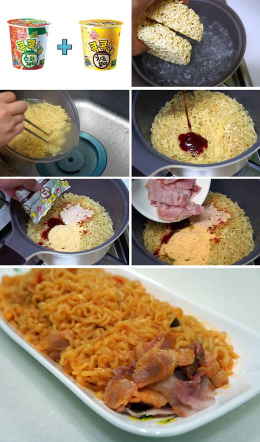- 끓는 물에 면을 넣고 끓인다. 컵라면 용 면이므로 불지 않도록 주의한다.- 면이 다 익으면 끓는 물을 종이컵으로 반 컵 가량 남기고 버린다.- 스파게티와 치즈볶이에 들어있는 액상, 분말, 건더기 수프 등을 모두 넣고 비비면 완성 +α그냥 먹어도 맛있는 베이컨을 이 음식에 잘게 잘라 섞어 먹어도 맛있다. 시식평:케첩 맛만 강한 스파게티를 한층 업그레이드 시켜주는 조합. 부드럽게 퍼지는 치즈향이 새콤한 맛을 제어해 풍미가 좋다. 자극적이지 않아 아이들 간식으로도 적절하다. 이 조합을 보고 로제 파스타를 생각하는 사람들도 있겠지만 전혀 다른 맛이다. 느끼함이 사라진 치즈볶이에 가깝다.