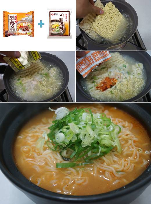 참가번호 2번.된장라면+사리곰탕면=된장곰탕 '구수하고 진한 맛의 신세계'조리과정- 800㎖ 끓는 물에 면과 건더기 수프를 넣고 삶는다.- 면이 반쯤 익었을 때 사리곰탕면 분말수프 1개, 된장라면 분말수프 2/3개를 넣고 2분간 끓이면 완성 +α곰탕 그릇에 담아 파 송송 썰어 얹으면 비주얼도 완성 시식평:된장의 구수한 향과 곰탕의 진한 맛이 어우러져 다분히 한국적인 느낌을 주는 조합. 매운맛을 선호하지 않는 사람에게 추천한다. 맛이 밋밋하다면 후추를 추가해도 좋다. 면보다는 국물 맛이 좋다. 해장용으로도 매우 적절. 다만, 24시간 한우로 우려낸 곰탕 같은 맛은 아니므로 너무 기대하지는 말자.