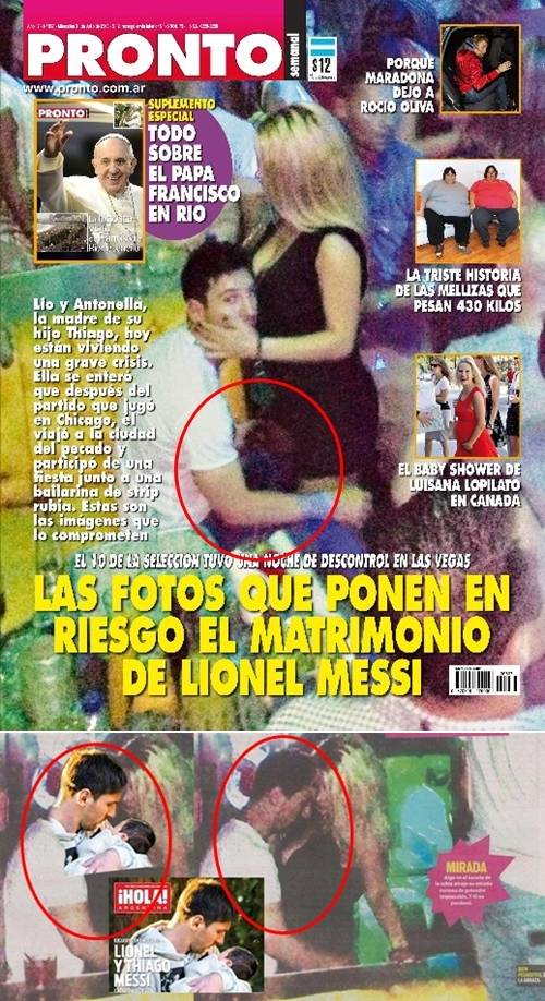 빨강 원 안에 아들 티아고의 머리가 있다(사진 위). 또 과거 '메시가 아들을 안고 찍은 사진'과 '메시가 금발 여성을 안고 있는 사진'이 똑같다. /사진=프론토 홈페이지 캡쳐 |