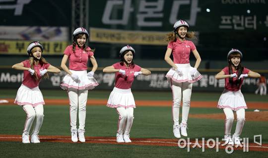 [아시아경제 정재훈 기자] 1일 오후 서울 목동야구장에서 열린 '2013 한국야쿠르트 세븐 프로야구' 넥센 히어로즈와 한화 이글스의 경기. 걸그룹 크레용팝이 클리닝타임 공연을 갖고 있다.