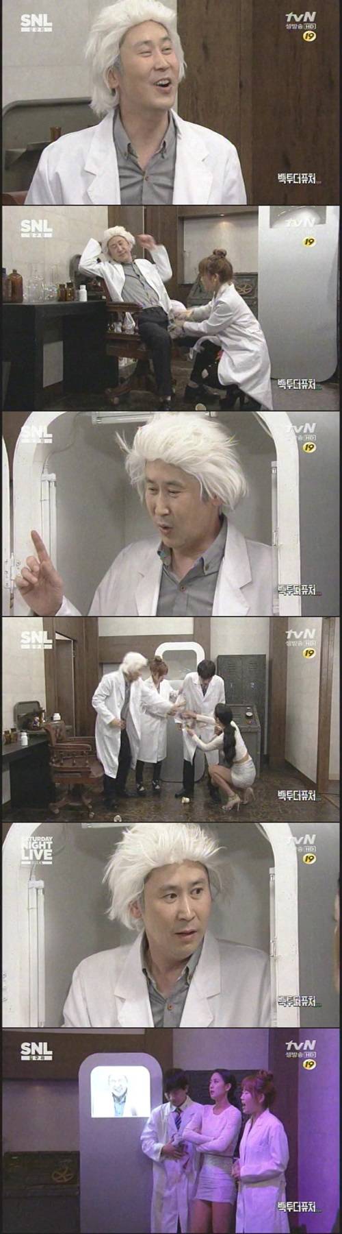 3일 방송된 tvN 'SNL 코리아' 시즌4에서 신동엽은 '백투더퓨처' 코너에서 타임머신을 발명한 박사로 변신했다. 신동엽은 먼저 죽은 아내를 치료하기 위해 백신을 들고 과거로 떠나겠다며 눈물을 글썽였다.