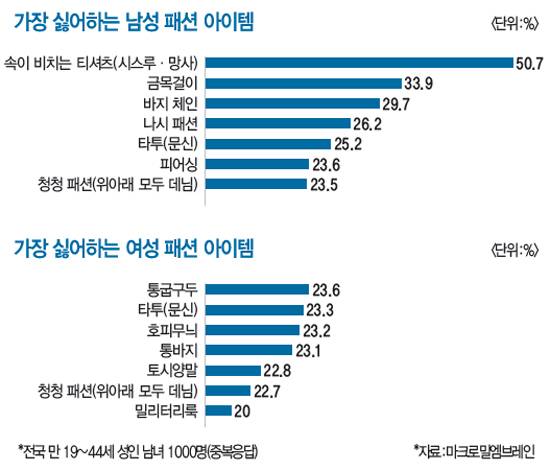 마크로밀엠브레인(trendmonitor.co.kr)이 전국의 만 19~44세 성인 남녀 1000명을 대상으로 조사한 결과 가장 싫어하는 남성 패션 아이템으로 '속이 비치는 티셔츠(시스루·망사)'가 꼽혔다. 무려 50.7%가 여기에 동의했다. 그 다음으로 '금목걸이' '바지 체인' '나시 패션' '타투(문신)' '피어싱' 등의 순서다. 남성은 특히 '속 비치는 티셔츠'와 '타투(문신)'를 싫어하는 남성 패션 아이템으로 응답한 반면 여성은 '속 비치는 티셔츠'를 1위로 꼽은 것은 같지만 그 다음으로는 '금목걸이'와 '바지 체인'을 싫어했다.