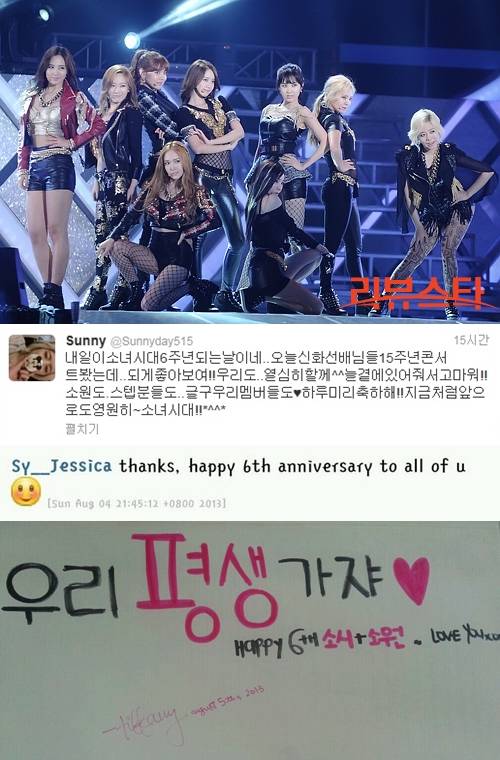 지난 4일 소녀시대 써니는 자신의 트위터를 통해 "내일이 소녀시대 6주년 되는 날이네. 오늘 신화선배님들 15주년 콘서트 봤는데 되게 좋아보여!! 우리도 열심히 할게 늘 곁에 있어줘서 고마워!! 소원도, 스태프분들도 그리고 우리 멤버들도♥ 하루 미리 축하해!! 지금처럼 앞으로도 영원히~ 소녀시대!!"라는 글을 게재해 소녀시대 6주년을 알렸다.