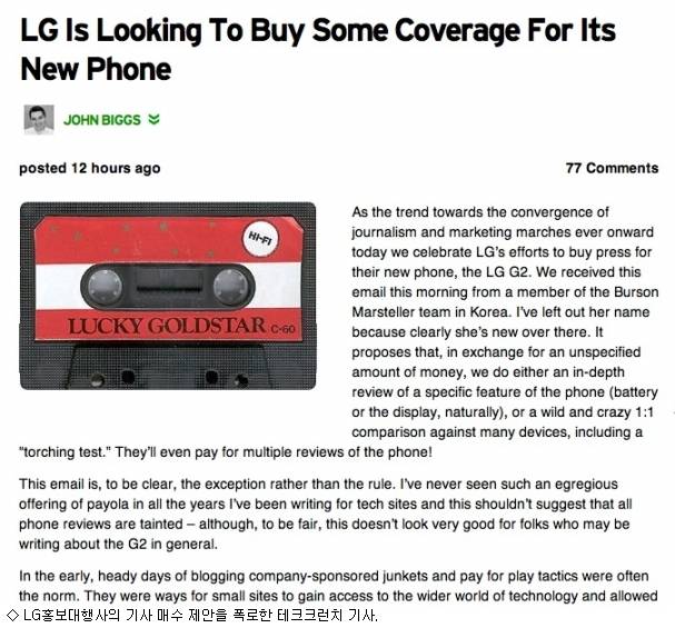 IT 전문 매체인 테크크런치는 5일(현지 시간) 'LG G2'에 대해 심층 기사를 써주는 대가로 돈을 주겠다는 제안을 받았다고 폭로했다. 테크크런치는 LG전자 해외 홍보를 맡고 있는 버슨 마스텔러 코리아가 이 같은 메일을 보내왔다면서 전문 그대로 공개했다.