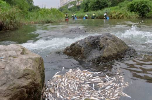 6일 오전 서울 성동구 상왕십리 인근 청계천 중류에서 서울시설공단 직원들이 전날의 기습적인 소나기로 빗물과 섞인 오수가 유입돼 떼죽음당한 물고기를 치우고 있다. 서울에는 이날도 시간당 20㎜의 폭우가 쏟아져 청계천 출입이 통제되기도 했다.