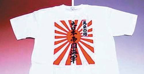 일본 온라인 쇼핑몰에서 판매하는 욱일기 티셔츠. 오른쪽 상단에 '만발한 벚꽃'이란 뜻의 한자가 쓰여 있다. 벚꽃은 '주저 없이 죽음을 택한다'는 무사도의 상징으로 여겨져 군 티셔츠에 많이 사용돼 왔다. 라쿠텐 홈페이지