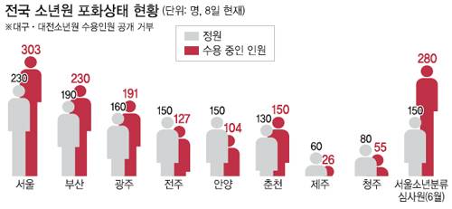 서울 소년원은 정원(230명)의 32%가 넘는 303명이 수용돼 있었다. 지난 5월 집단 난투극이 발생했던 부산소년원의 경우 사건 연루자 50여명을 분산 수용했는데도 정원의 21%를 초과했다.