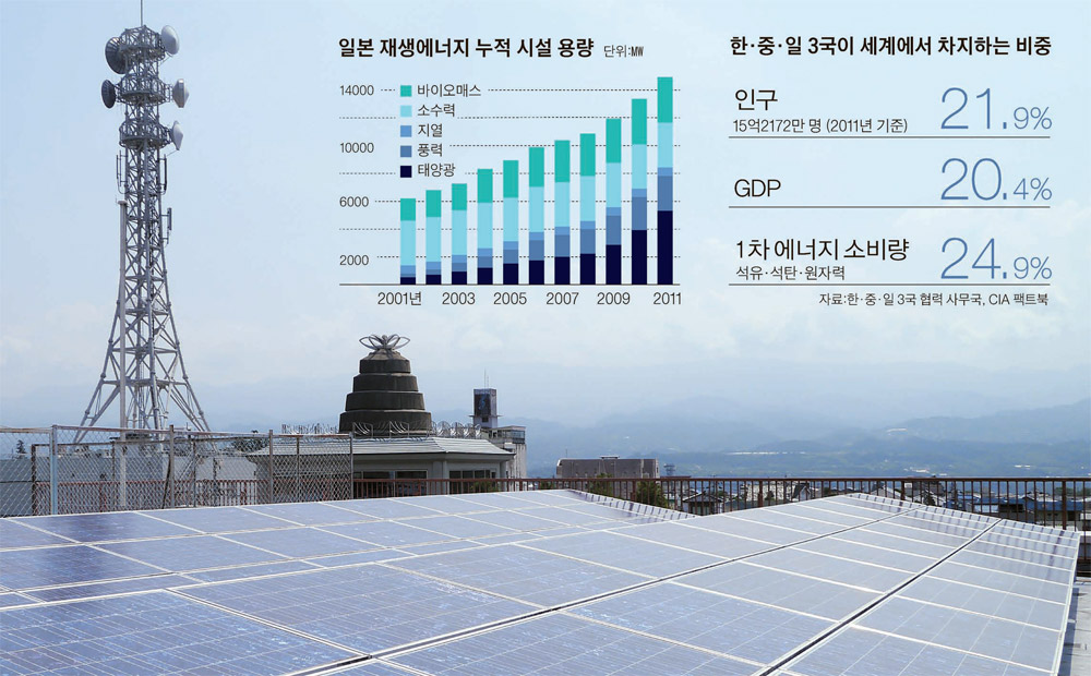 세계 경제의 중심으로 부상 중인 아시아에서도 핵심 3국으로 꼽히는 한국·중국·일본. 이 세 나라는 세계 인구의 21.9%(15억2172만 명, 2011년 기준), 세계 국내총생산(GDP)의 20.4%(2011년 기준)를 차지하고 있다. 문제는 경제 성장에 필요한 에너지 수요 또한 급증하고 있는 점이다. 예컨대 3국은 석유·석탄·원자력 등 1차 에너지의 소비량은 24.9%(2010년 기준)다. GDP 비중보다 높다.